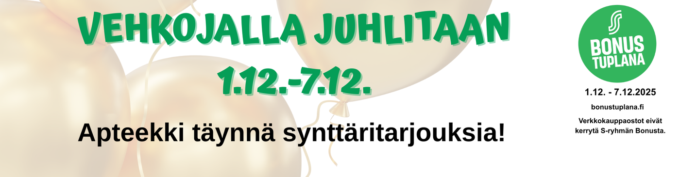 Saat S-Etukortilla Bonusta apteekkimyymälässä maksetuista tuotteista ja palveluista. Bonus ei kerry resepti- tai itsehoitolääkkeistä eikä verkkokauppaostoista.