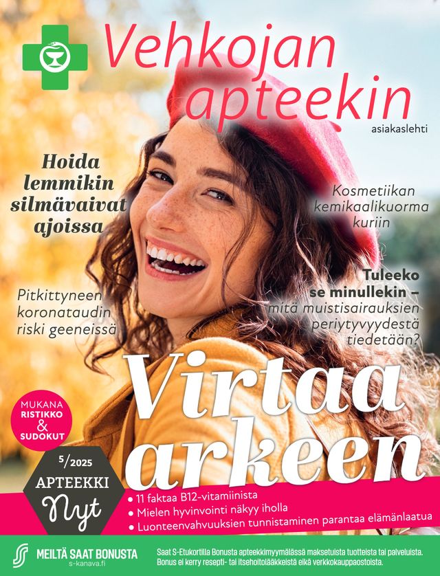 Saat S-Etukortilla Bonusta apteekkimyymälässä maksetuista tuotteista ja palveluista. Bonus ei kerry resepti- tai itsehoitolääkkeistä eikä verkkokauppaostoista.